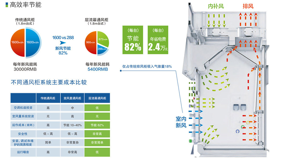 對排風柜內(nèi)部氣流組織進行千次模擬,自主研發(fā)的產(chǎn)品;不但加速有害氣體的排出,同時減少了排風柜的總排風量。
